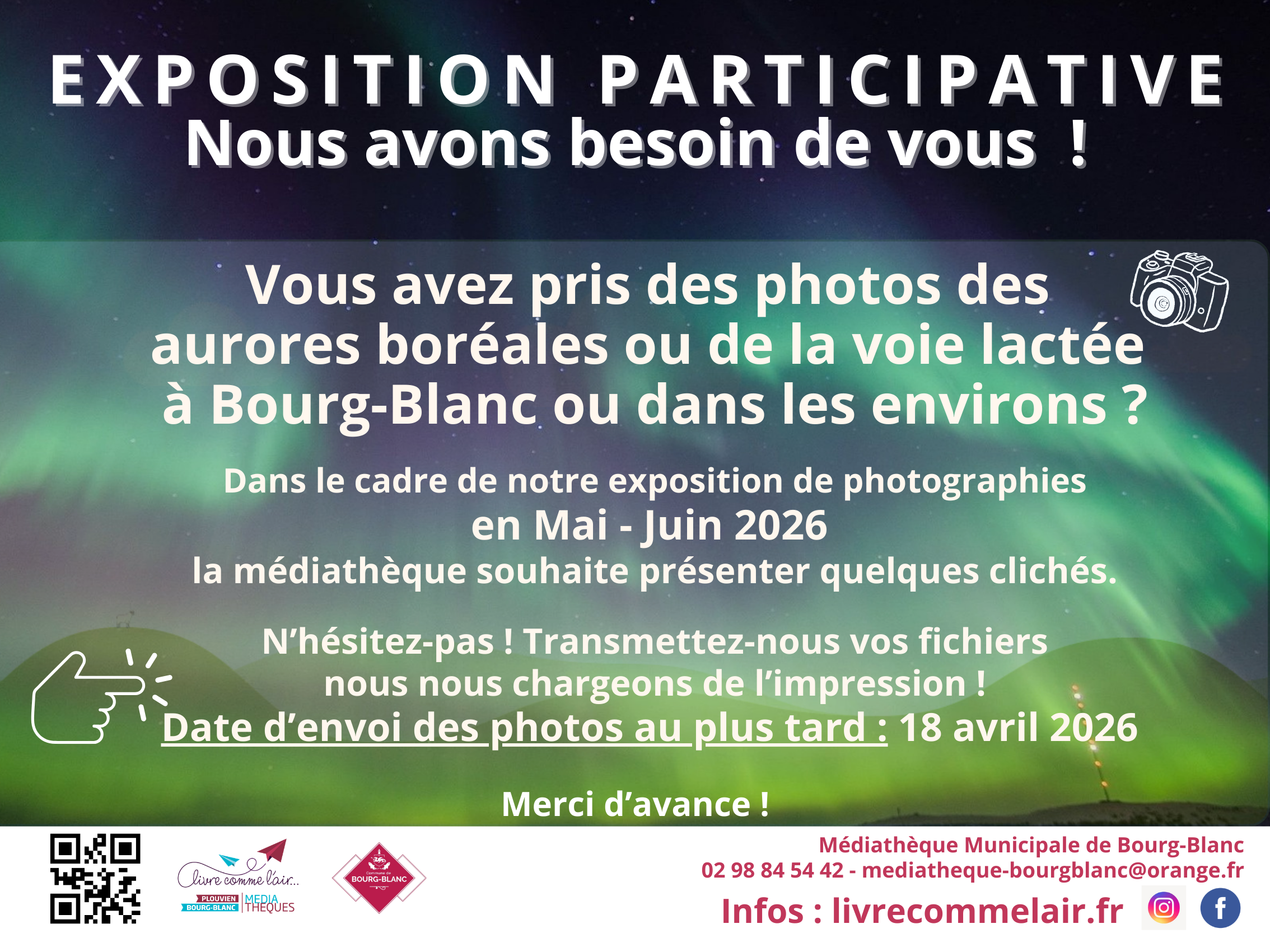 Vous avez pris des photos des aurores boréales à Bourg-Blanc ou dans les environs ? Dans le cadre de notre exposition de photographies en Mai – Juin 2026, la médiathèque souhaite présenter quelques clichés. N’hésitez-pas ! Transmettez-nous vos fichiers, nous nous chargeons de l’impression !